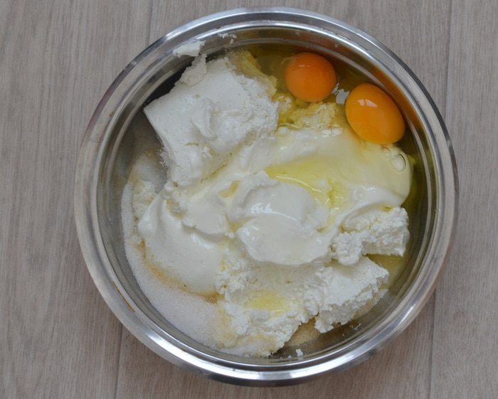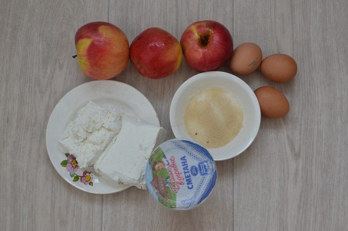 Далее готовим начинку. На фото нет сливочного сыра, так как в этот раз готовила без него, но взяла творога «Домик в деревне» 400 г, сметаны 240 г. Яблоки лучше использовать кисло-сладкие.