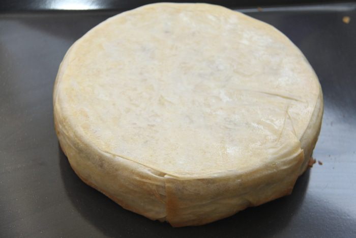 Верх накрыть двумя листами фило (конечно смазать маслом). Поднять свисающие края теста к центру. Верх смазать маслом.
