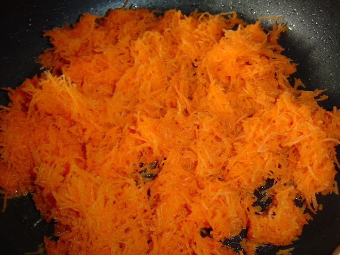 Морковь тушим на сливочном масле около 10 минут, затем перекладываем в миску и даем остыть.