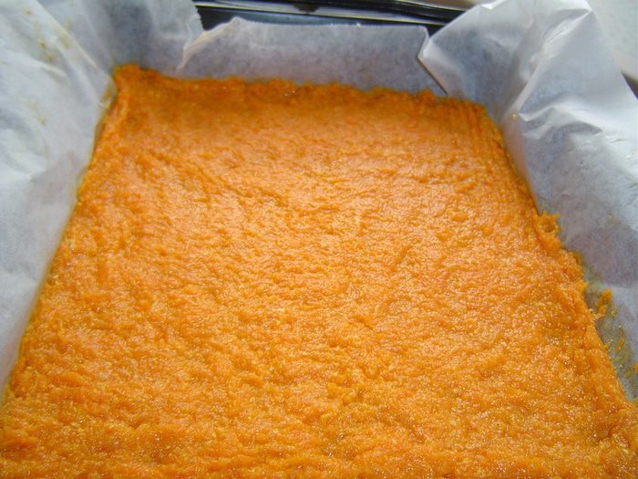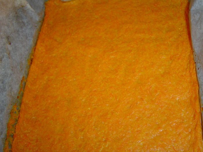 Противень застилаем пергаментной бумагой, сверху выкладываем морковно-белковую смесь, разравниваем и выпекаем при 180гр. 15 минут.