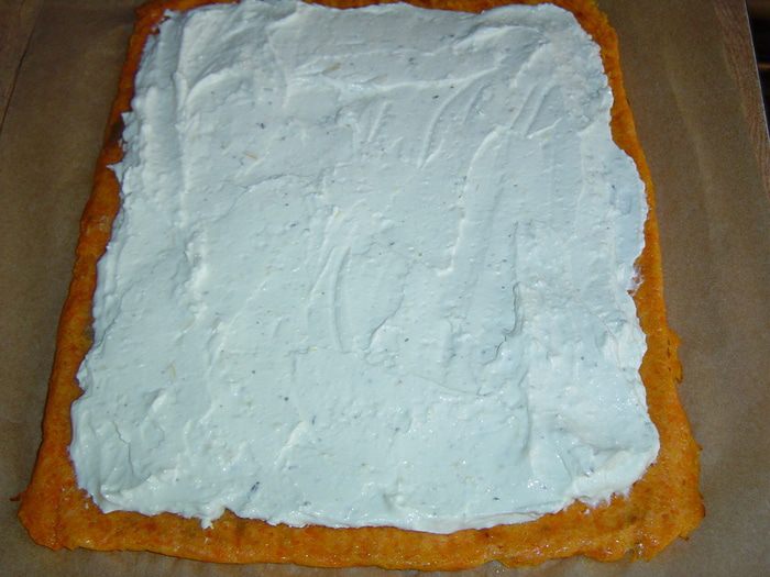 С морковного коржа убираем полотенце, накрываем сверху листом пергамента, переворачиваем на него и аккуратно снимаем нижний лист пергамента.Творожную массу намазываем на морковный корж.