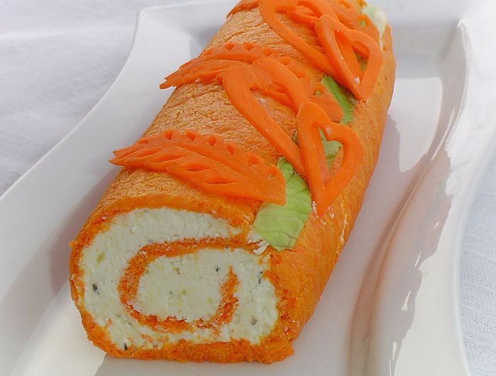 Это необычный, яркий, с пикантным вкусом морковно-творожный рулет, который будет хорош как на праздничном столе, так и на повседневном.