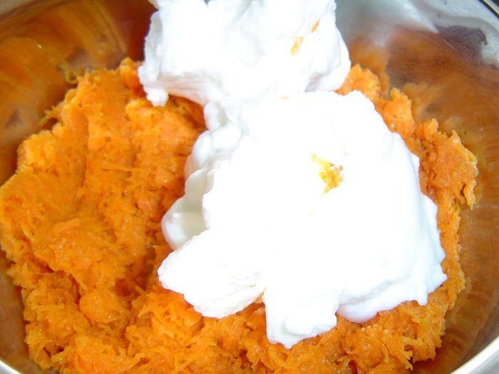 Белки взбиваем со щепоткой соли, а затем добавляем к моркови, аккуратно перемешиваем до однородного состояния.