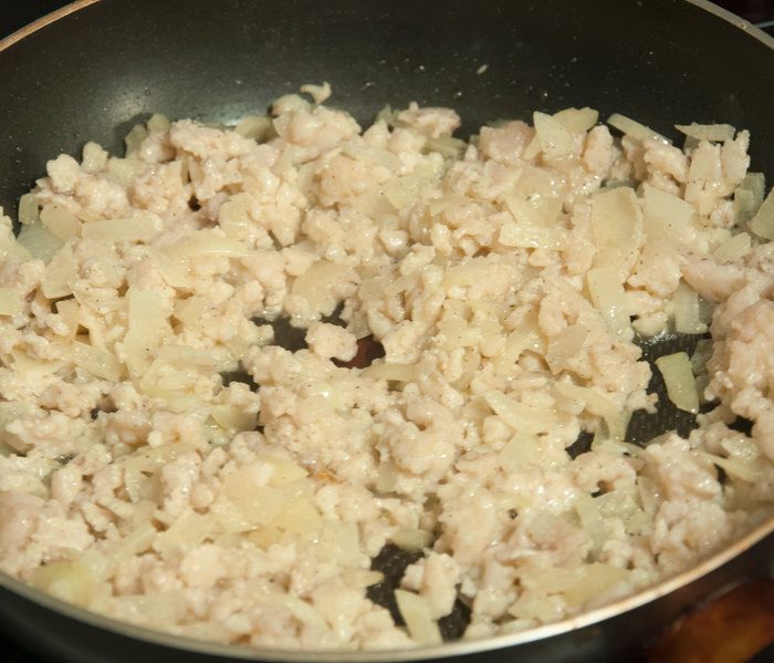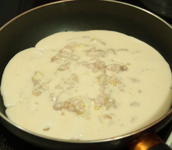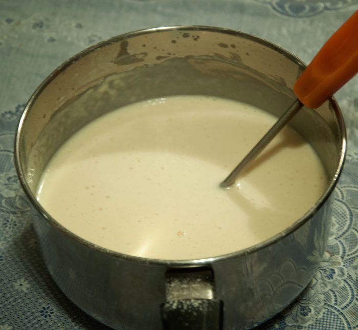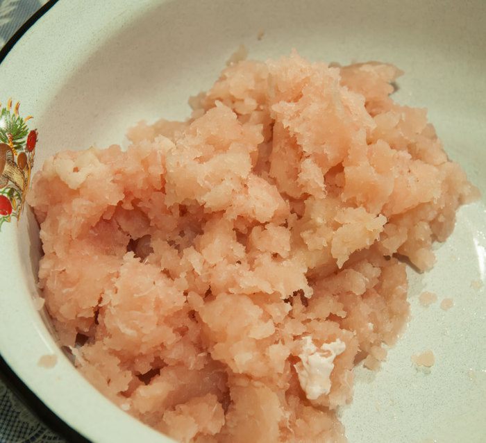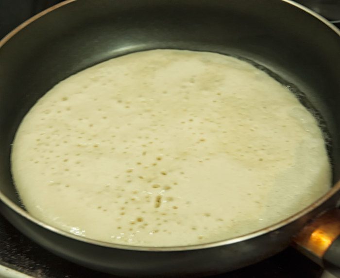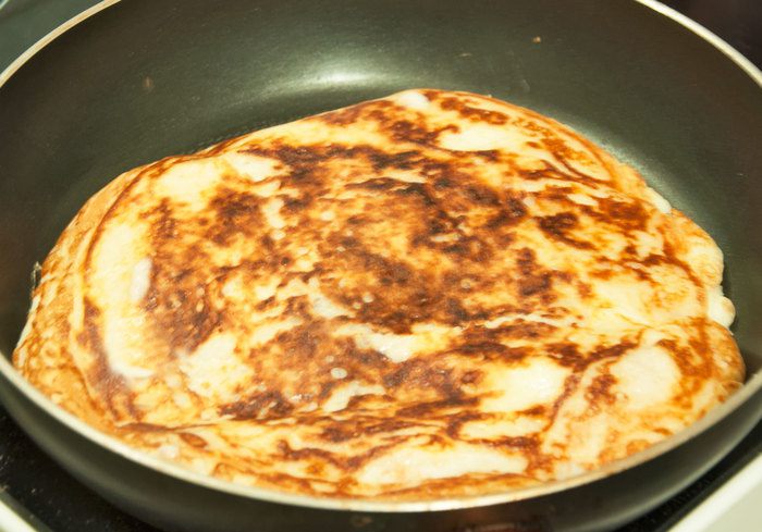 Замешиваем тесто для блинчиков на кефире. Для этого взбиваем 2 яйца, стакан кефира, добавляем столовую ложку растительного масла, ложку сахара, солим, стакан муки и перемешиваем. Чайную ложку соды без горки гасим столовой ложкой лимонного или апельсинового сока. Добавляем в тесто и сразу перемешиваем. Если тесто получилось очень густое, разбавляем кипяченой холодной водой.