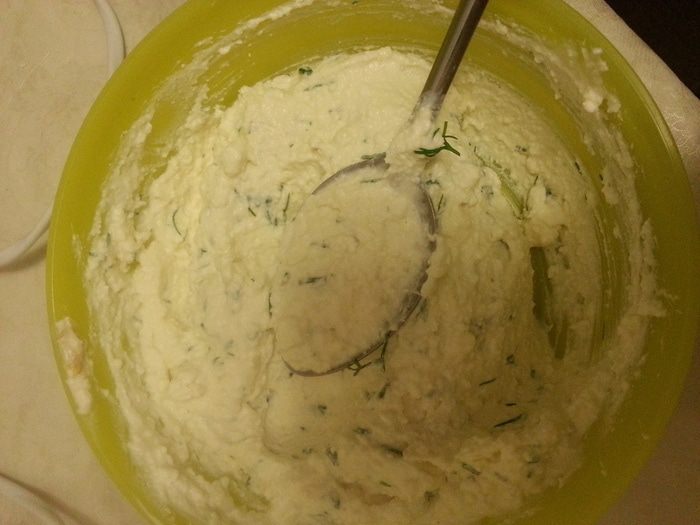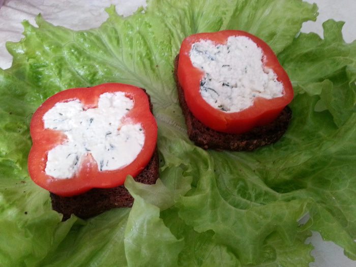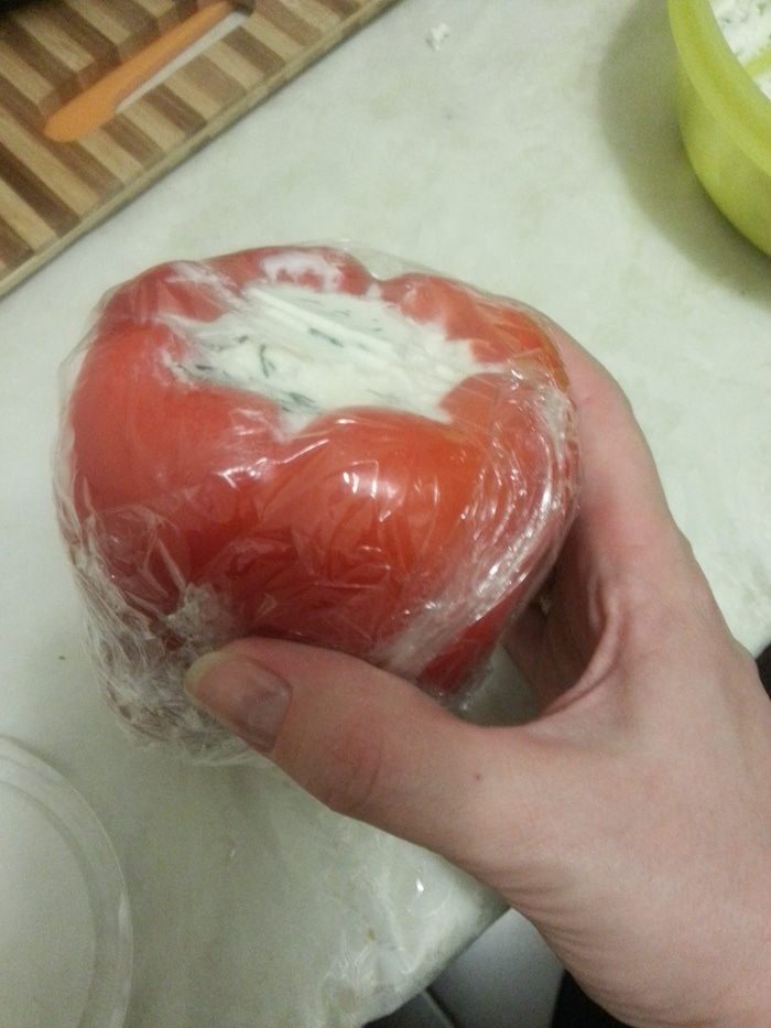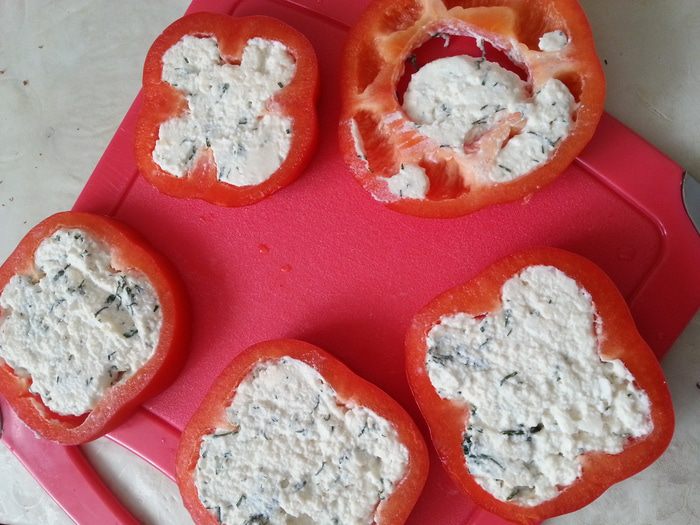 Моем перец, вырезаем плодоножку и внутренние перегородки. Фаршируем творожно-сырной массой. Убираем в холодильник минимум на 15-20 минут. Можно и на ночь.