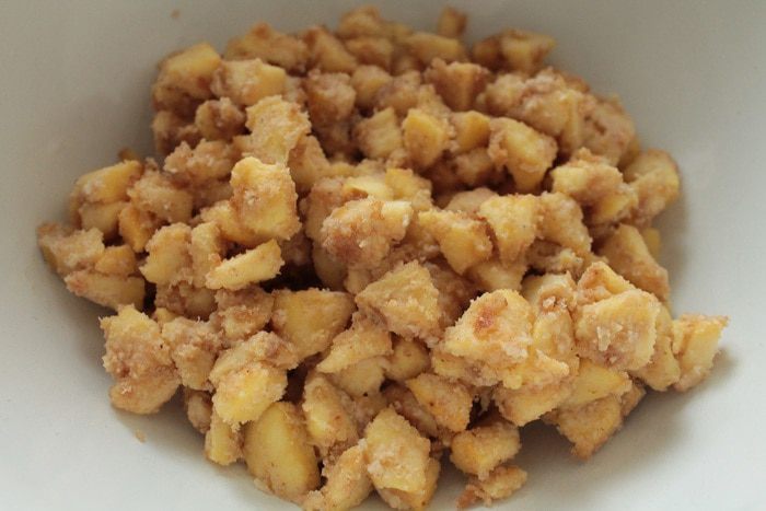 Яблоки почистить, удалить сердцевину, нарезать кубиком (у меня получилось 300 грамм в нарезанном виде), сбрызнуть лимонным соком. Нагреть сковороду, растопить сливочное масло, затем добавить овсяную муку, прогреть 1 минуту, добавить лимонный сок и цедру, нарезанные яблоки. Постоянно помешивая, обжарить яблоки до полумягкого состояния (5-7 минут). Выключить огонь и дать остыть под крышкой.