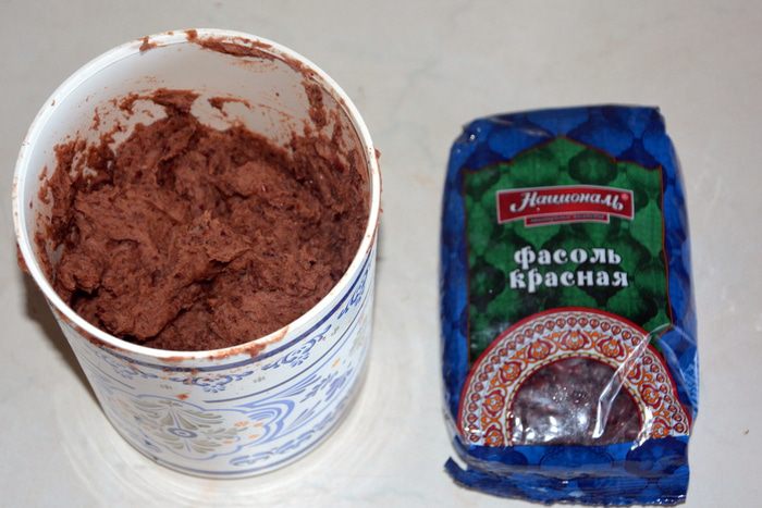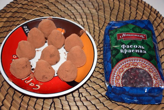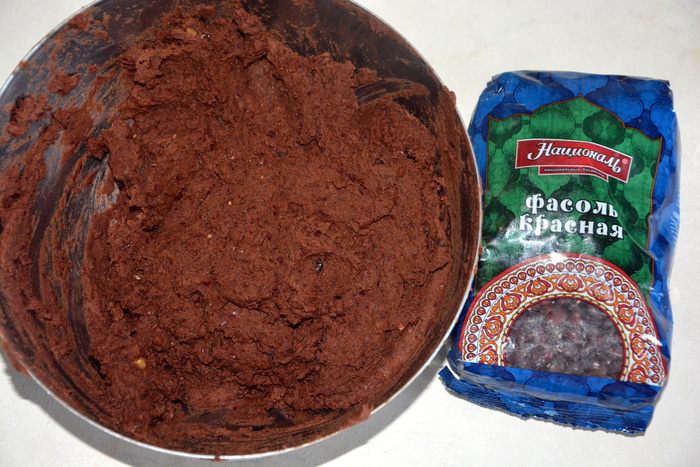 В чаше блендера порциями измельчить вареную фасоль. Добавить чернослив и снова измельчить до однородной массы. Добавить какао и мед, перемешать.