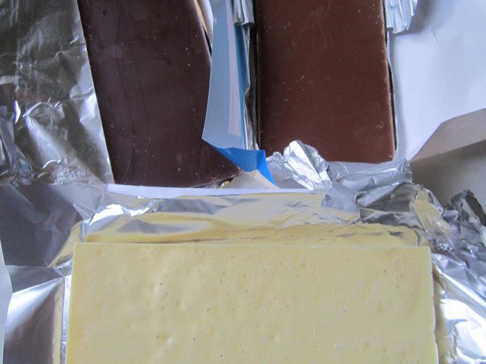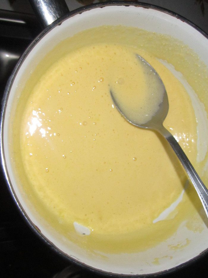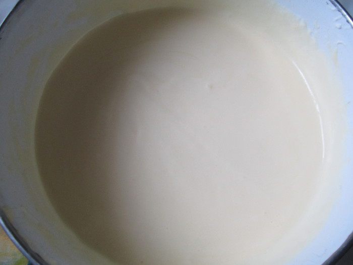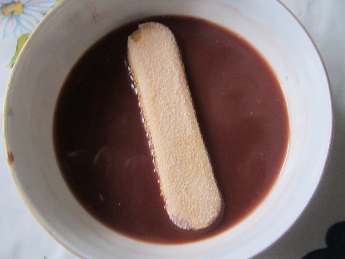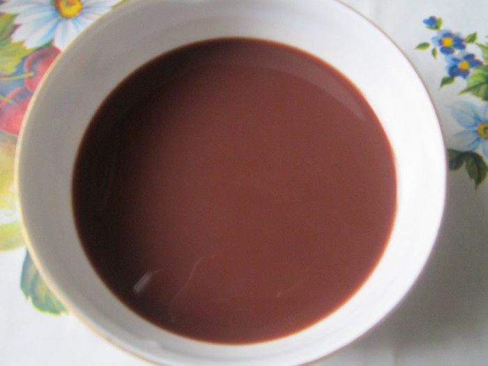 Сделаем пропитку. Для этого нужно сварить какао. Нам понадобится всего лишь одна чашка напитка, поэтому его можно не варить в отдельной кастрюле. Нужно смешать какао-порошок и сахар. Залить кипящей водой, постоянно помешивая ложкой. Добавить молоко и тщательно перемешать. Остудить. По желанию можно добавить ложку коньяка.