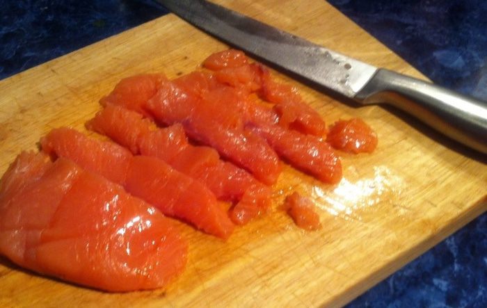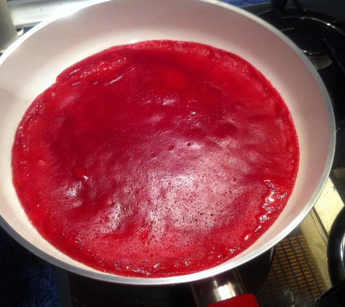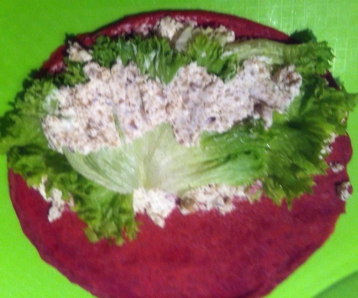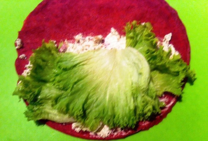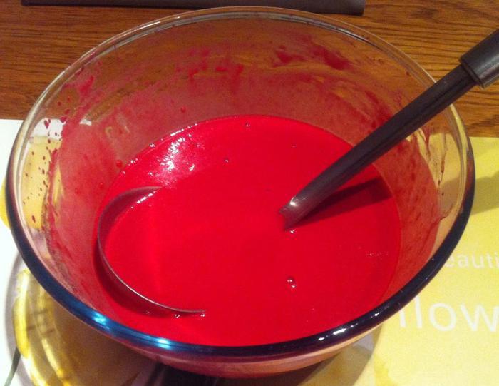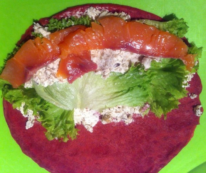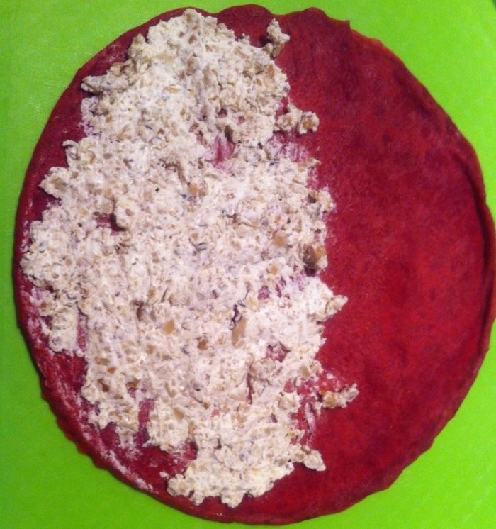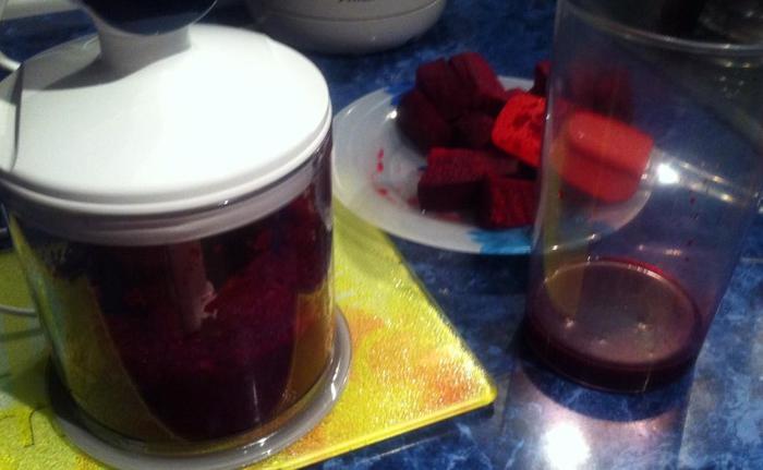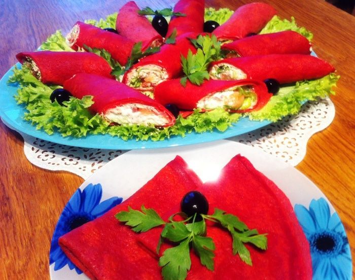 Взбиваем яйца с солью, добавляем блинную муку (было уже очень поздно, поэтому блины готовила по ускоренному варианту, вы можете приготовить блины по своему любимому несладкому рецепту), свекольный сок и хорошо перемешиваем. Я все взбивала венчиком от блендера. Вливаем растительное масло и еще раз хорошо перемешиваем. У меня получилось, на мой взгляд, слишком густое тесто, а я хотела блинчики потоньше, поэтому я долила еще немного кипятка. Вы можете сразу уменьшить количество муки.