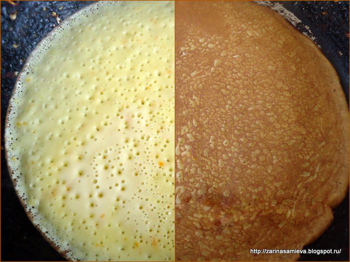 Сковороду хорошо разогреть. Перед выпечкой первого блина сковороду смазать маслом, после этого делать не надо. Выпекать блинчики с двух сторон до золотистого цвета. Каждый готовый блин укладывать в стопочку и смазывать растопленным сливочным маслом.