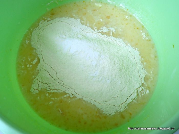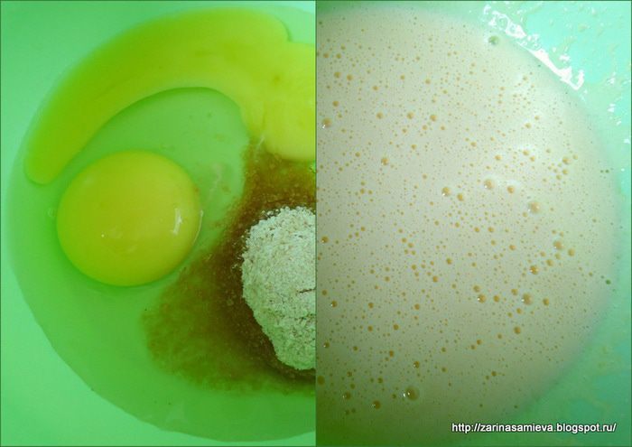 Муку просеять в чашу к жидким ингредиентам, хорошо взбить миксером, чтобы не было комочков, в конце добавить растительное масло.