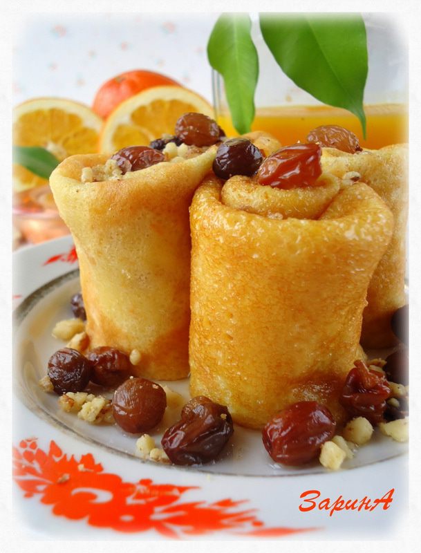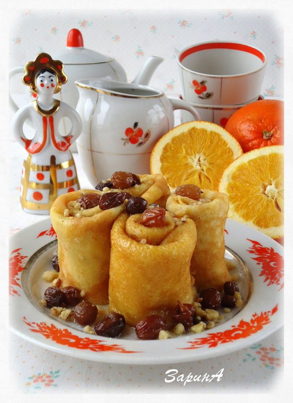 Блинчики скрутить в рулоны, поставив на тарелку полить их сиропом с орехами и изюмом.