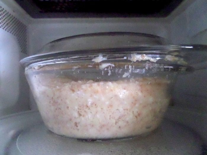Смазываем стеклянную форму для СВЧ (дно диаметром 13 см,верх диаметром 16 см) маслом и распределяем творожную массу.