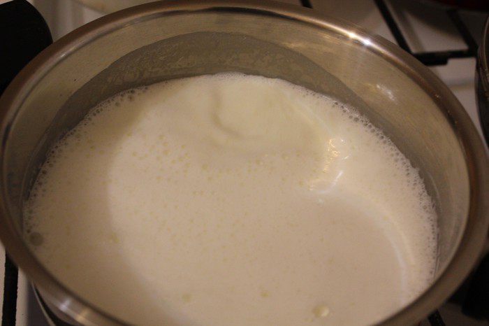 Сметана годится 15 или 20%, главное она должна находиться в самом начале своего срока годности. Если хотите узнать, какой пользуюсь всегда я, пишите в личку. Ставим молоко на плиту и доводим его до кипения.
