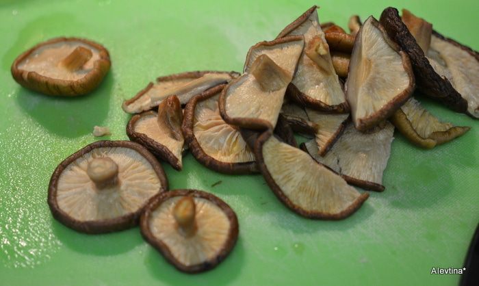 Обожаю грибы шиитаке за приятный вкус. Используем сушеные или свежие. Сушеные предварительно замачиваем, как написано на упаковке на 30 мин.