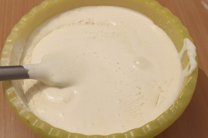 Отложить несколько ложек теста в тёплое молоко и перемешать. Влить массу в основное тесто, перемешать.