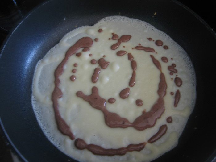 На сковородку без масла наливаем меньше половины половника теста, сверху наливаем хаотично смесь с какао. делаем все очень быстро.Переворачиваем на другую сторону буквально на секунд 30.
