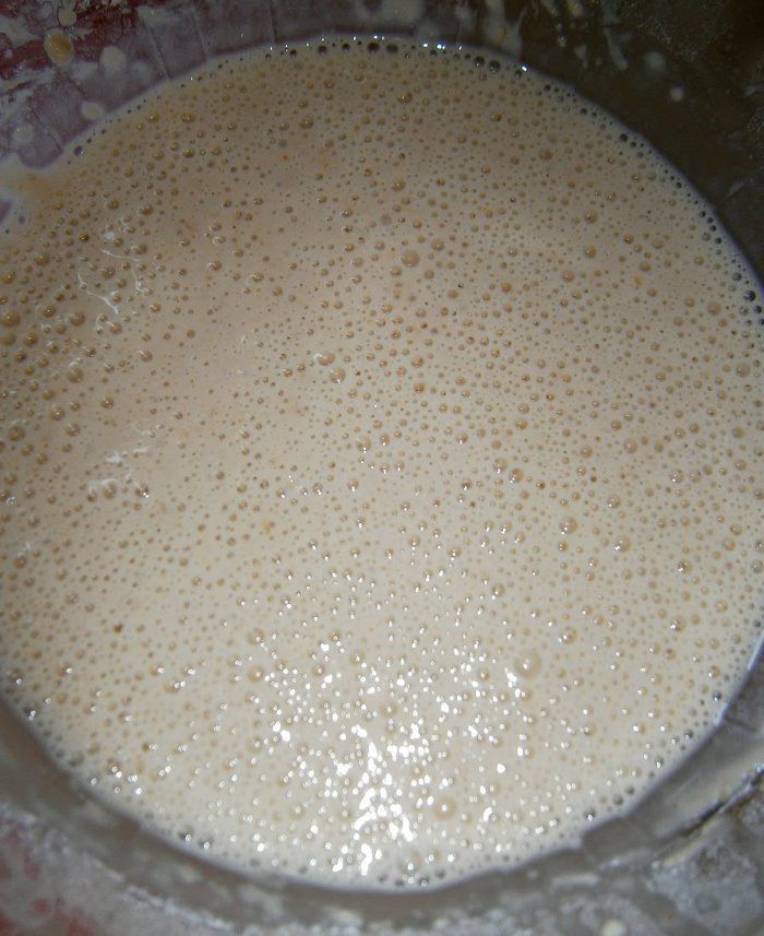 В половину стакана горячей воды всыпать соду, быстро перемешать и влить в тесто. Перемешать и дать постоять 5 минут.