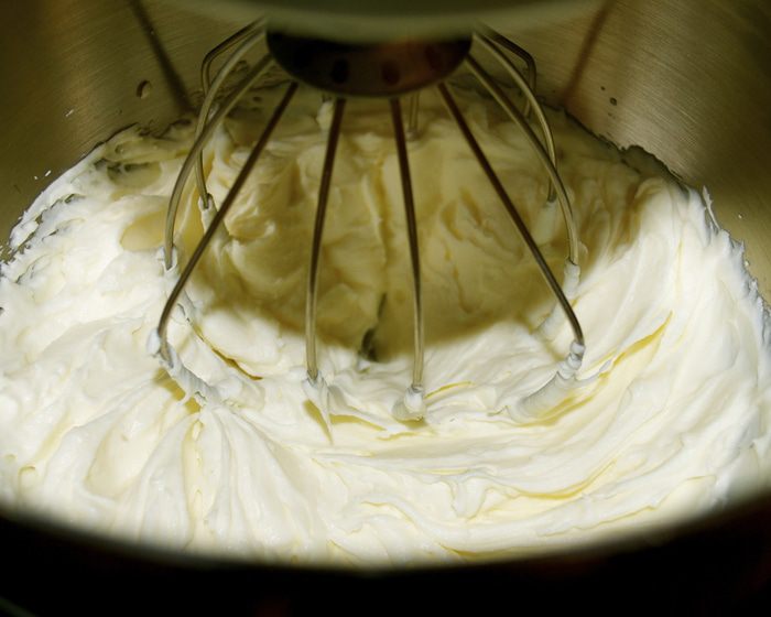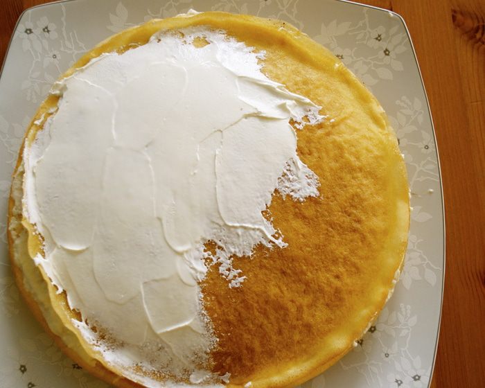 Для крема сыр маскарпоне комнатной температуры взбить до пышности со сгущеным молоком. Тем временем отдельно развести агар-араг в горячем молоке, дать остыть. В данном случае я использовала агар-агар, т.к. у меня закончился желатин, а обычно я развожу 10 г листового желатина. Добавить разведенный загуститель с кремом.