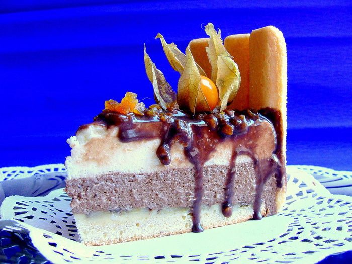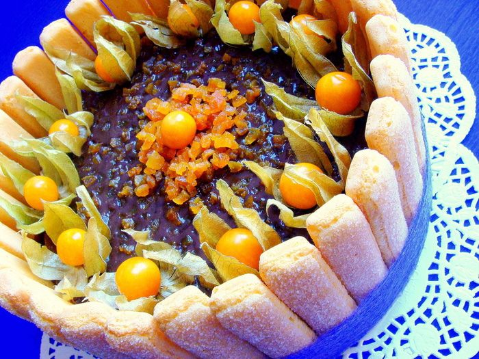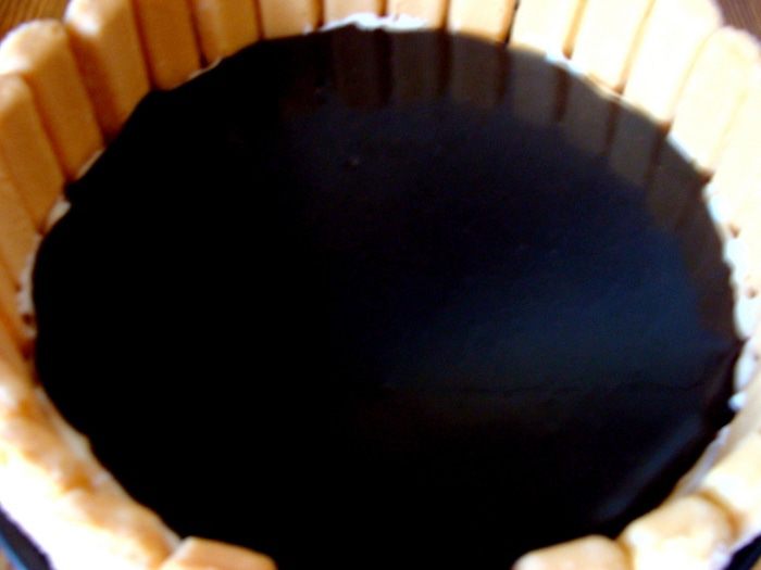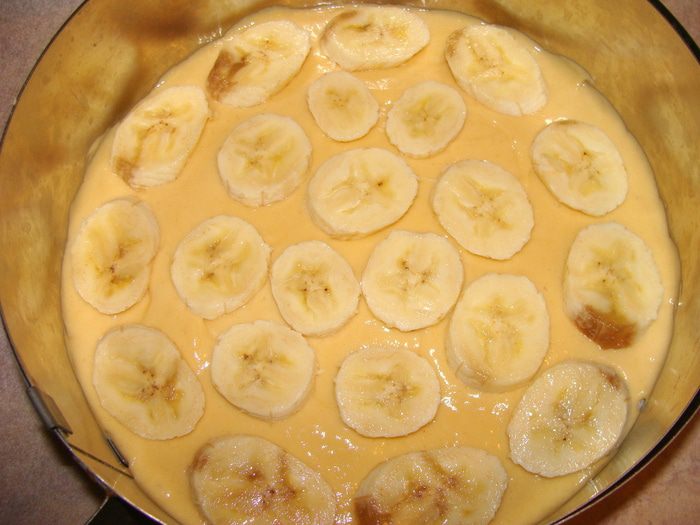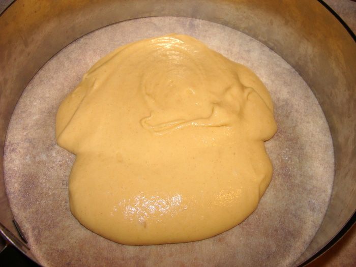 Постепенно добавить взбитые желтки, потом понемногу муку, продолжая взбивать. Тесто выложить в разъемную форму (хотя не обязательно, корж хорошо выйдет и из обыкновенной формы). У меня форма была без дна, я застелила противень пекарской бумагой, на нее установила форму и вылила тесто. Размер формы 23-24 см. Такое количество теста, можно распределить и на более большую форму, корж будет просто потоньше.