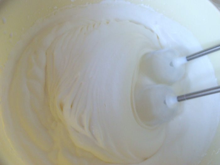 Белки взбить в густую пену до устойчивых пиков, с щепоткой соли. Потом добавить оставшийся сахар, продолжая взбивать.
