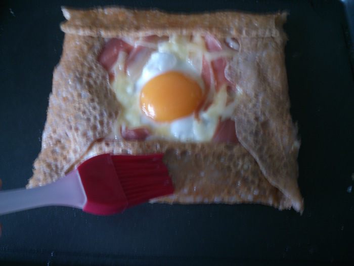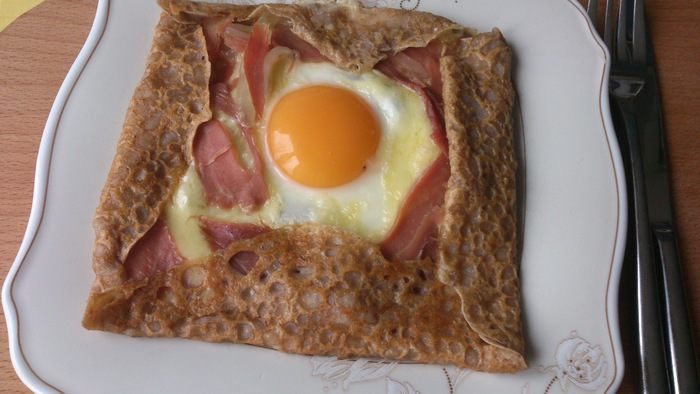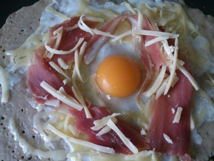 Рецепт этих блинчиков я увидела в одной телепередаче о кулинарных путешевствиях по Франции. Их особенность заключается в том, что тесто состоит из воды, соли и гречневой муки. А самое интересное, что повар замешивал его произвольно, просто посолил воду и всыпал муку до консистенции жидкой сметаны. Но есть один нюанс - тесто должно постоять в холодильнике перед выпечкой 24 часа. В передаче был показан классический вариант блинчиков с начинкой из сыра, яйца и вареной ветчины. Но эти блинчики будут хороши также с любой сладкой начинкой. За неимением вареной ветчины я использовала прошутто.