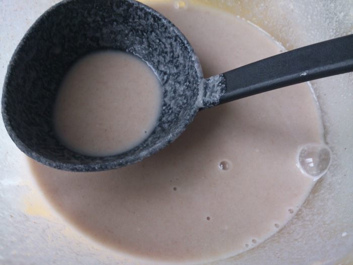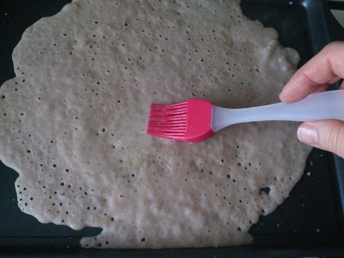 Сковороду хорошо разогреть, смазать немного растительным маслом. Налить тесто и распределить по поверхности.