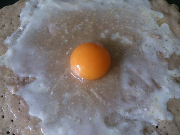 На середину блинчика вылить яйцо и слегка растянуть белок по поверхности.