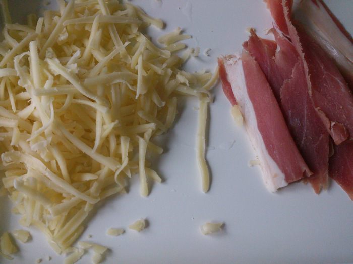 Сыр натереть на терке и нарезать ветчину тонкими полосками.