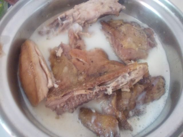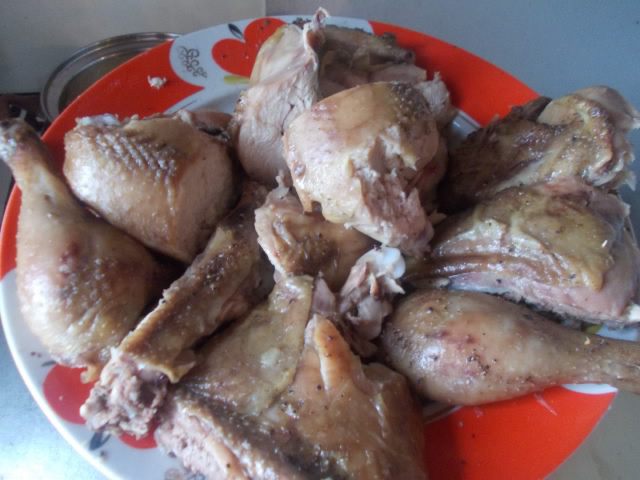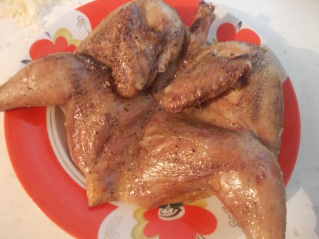 Курицу разрезать вдоль грудки. Втереть в нее немного соли и перца, отправить на противень и запекать до готовности и золотистого цвета. У меня это заняло около 30 минут при 200 С, но если курица побольше, то нужно около 40-50 минут и температуру регулировать, чтобы не сгорела. Периодически доставать и поливать выделившимся соком.