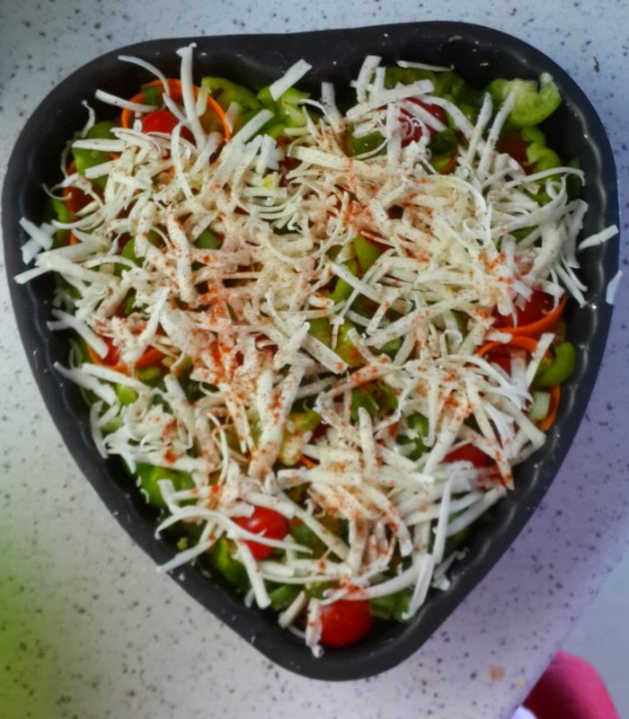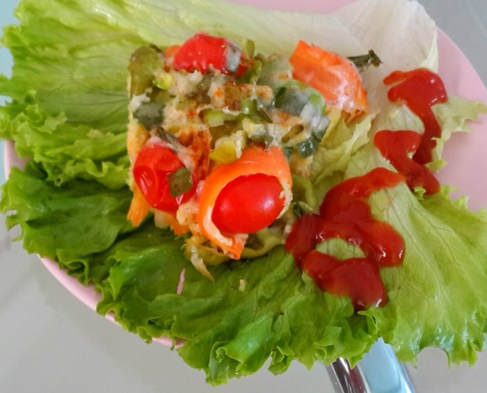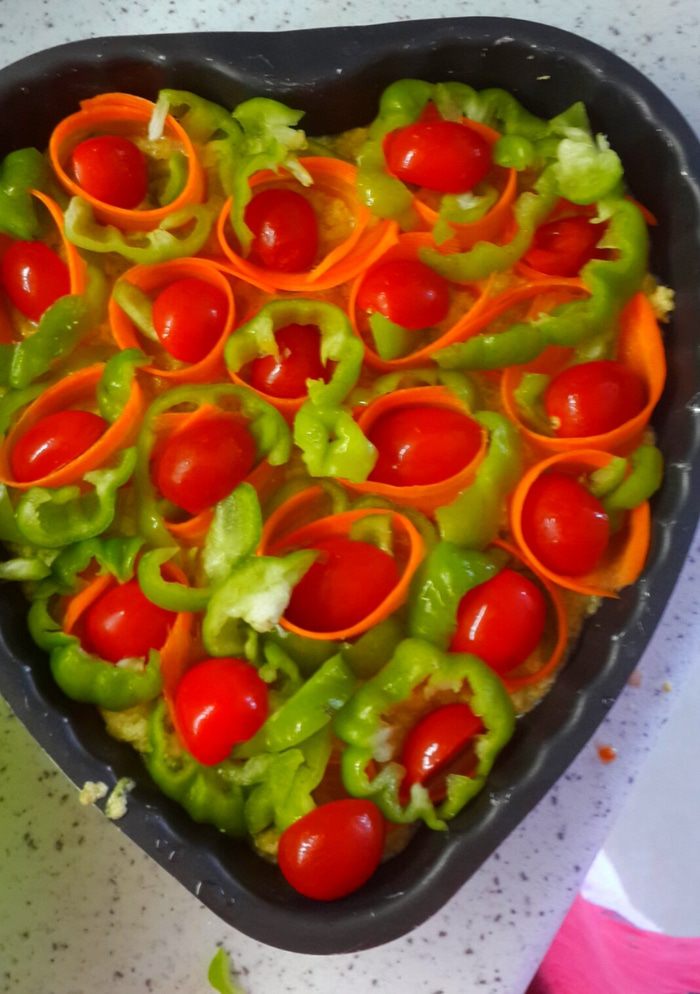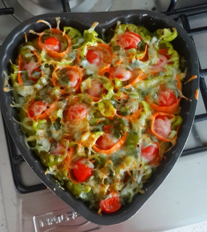 Подаем на салатных листьях. И куда же без кетчупа чили.... это же пицца)))) вот такая полезная, я даже сказала бы диетическая пицца готова. На вкус: приятная, нежная. У меня морковка и перец чуть хрустели,но мне это понравилось. Псевдо тесто напоминает кабачковые оладушки..... прелесть а не пицца)))))