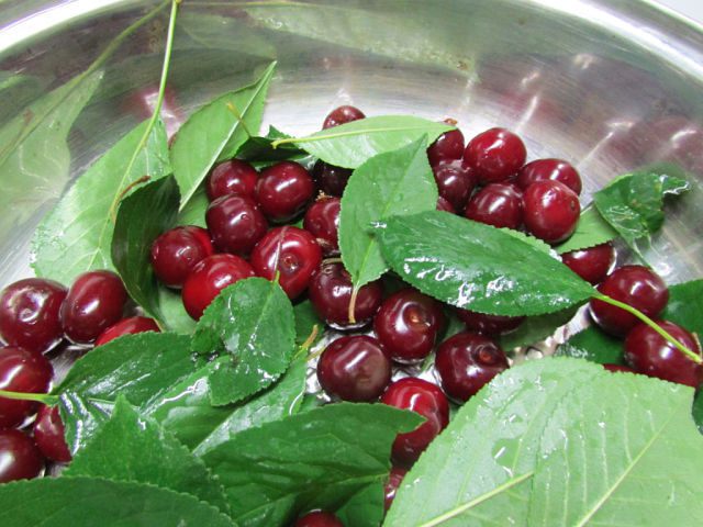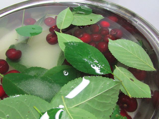 Выложить в кастрюлю или глубокую сковороду ягоды и листья. Ягоды не мять!!!!!