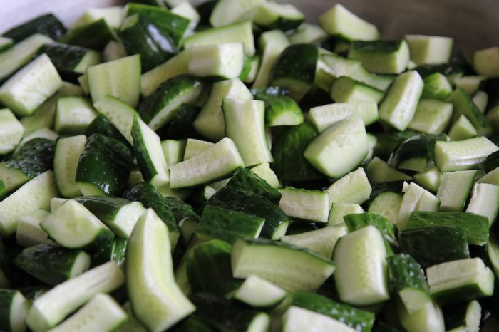Огурцы моем, обрезаем с двух кончиков и нарезаем брусочками, складываем в таз.