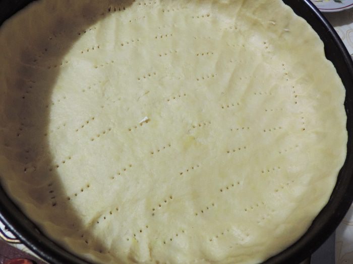 Тесто равномерно распределяем по форме. У меня круглая диаметром 26 см. Дно формы я выстилаю бумагой, чтоб пирог было легче достать, бока ничем не смазываю. Не забываем про бортики, лучше их сделать повыше. Часто накалываем тесто вилкой.