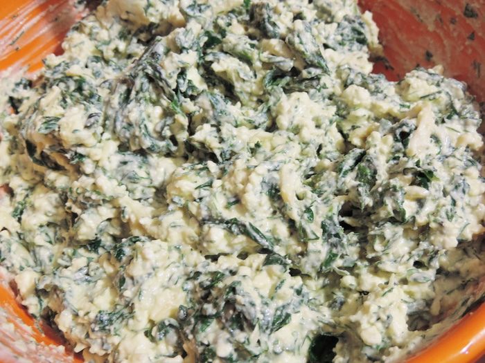 Ошпаренный шпинат нарезаем как можно мельче. Промытые укроп и петрушку тоже измельчаем. Добавляем в творог измельченную зелень, сметану и примерно 100г тертого сыра. Солим по вкусу, но не забываем, что сыр тоже соленый.
