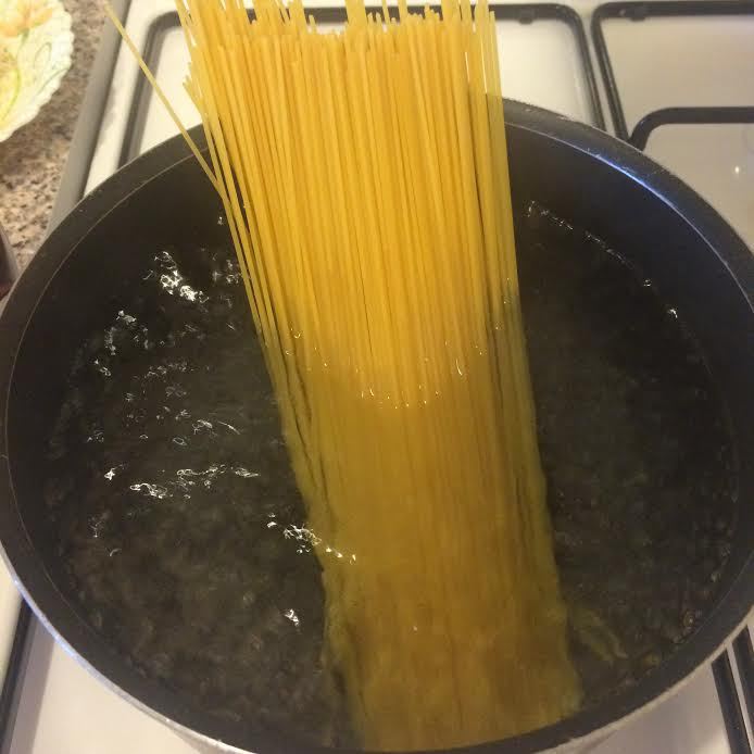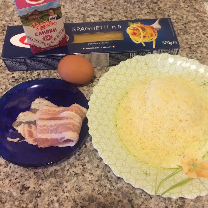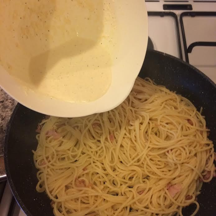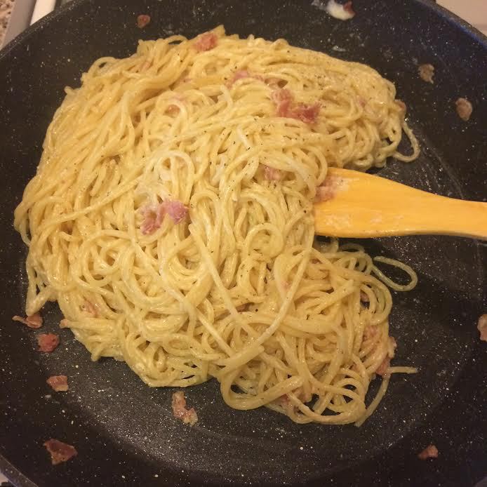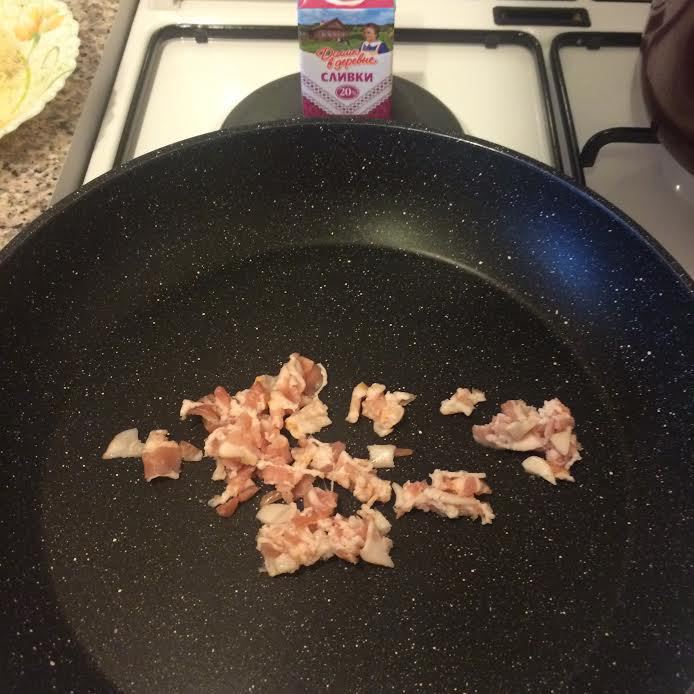 Готовые спагетти переложить на горячую сковороду, где жарился бекон, перемешать. Затем добавить бекон.