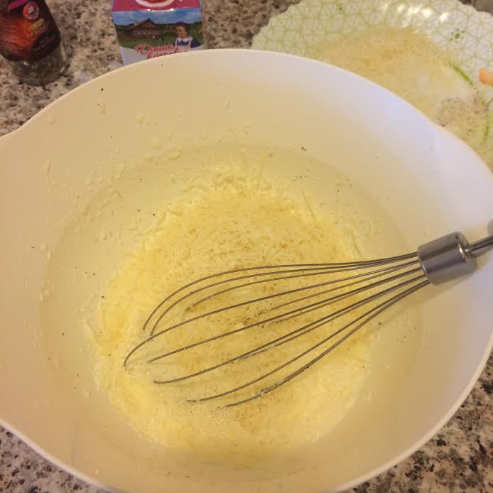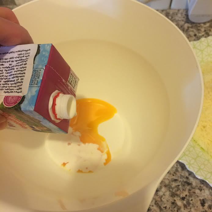 В миске смешать желток, сливки «Домик в деревне» и хорошо взбить венчиком.