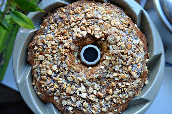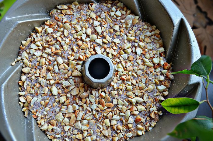 После этого выложите остальное тесто, равномерно распределяя до стенок формы. Сверху посыпьте ореховой смесью, слегка придавливая орехи в тесто.