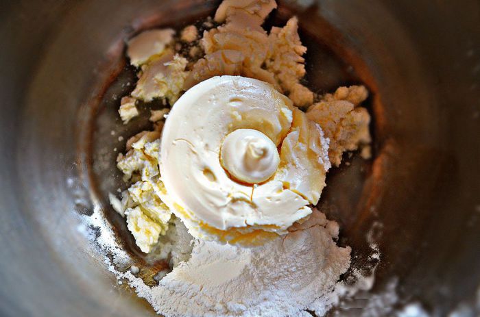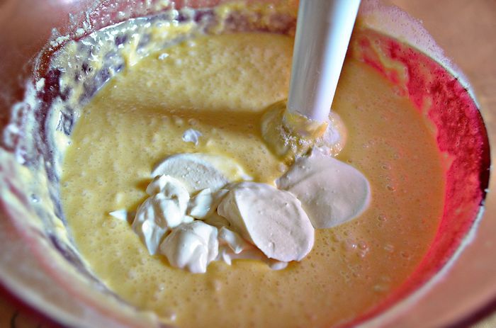 Затем добавьте попеременно порциями сметану и муку, продолжая взбивать.