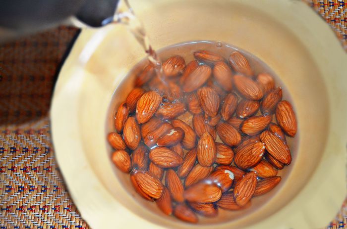 Миндальные орехи залить кипятком, дать постоять 5 мин, затем очистить их от шелухи.