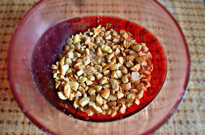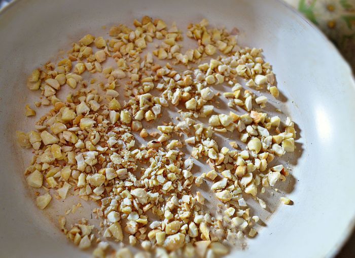Орехи порубить и выложить на сухую сковороду. Подсушить орехи на маленьком огне и слегка подрумянить.