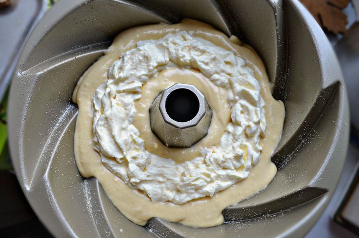 Выложить половину теста в большую форму для кекса. Сверху выложите сливочный сыр, не доходя до стенок формы по 1- 1,5 см.