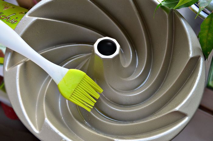 Форму для кекса смазать растительным маслом, присыпать манкой.