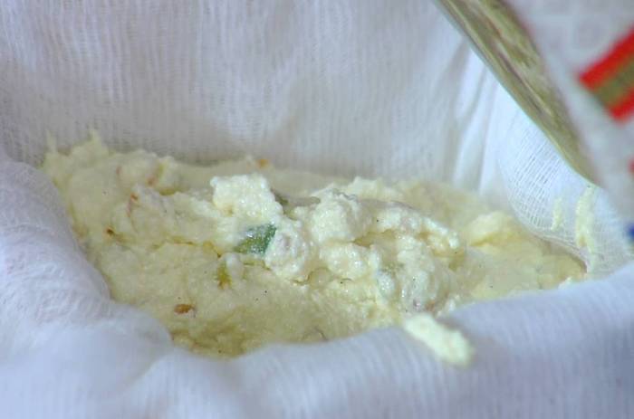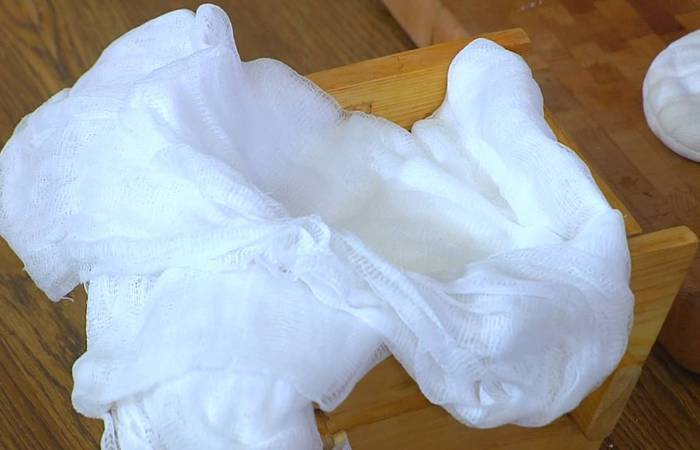 Форму для пасхи выстелить сложенной в несколько слоев марлей, выложить творожную массу, накрыть крест-накрест краями марли, так чтобы концы ее свешивались из формы.