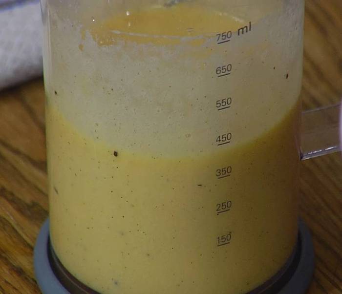 Яйца соединить с сахаром, добавить измельченные стручки ванили и взбить блендером с насадкой-венчиком в пышную массу. Продолжая взбивать, влить апельсиновый ликер.