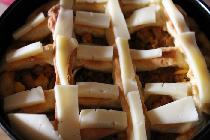 Как только пирог начнет приобретать слегка золотистый цвет, достать его из духовки. Сыр нарезать брусочками и разложить его на решетке из теста. И опять отправить в духовку на 5-8 минут..