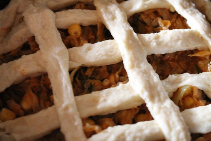 Выкладываем начинку, равномерно распределяя ее. Из оставшегося теста делаем решетку. И отправляем наш пирог в заранее разогретую до 190 градусов духовку, на 20-30 минут.