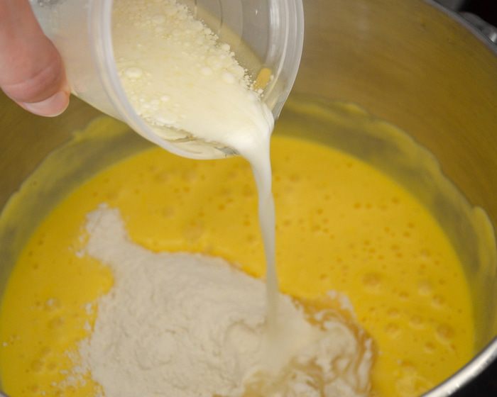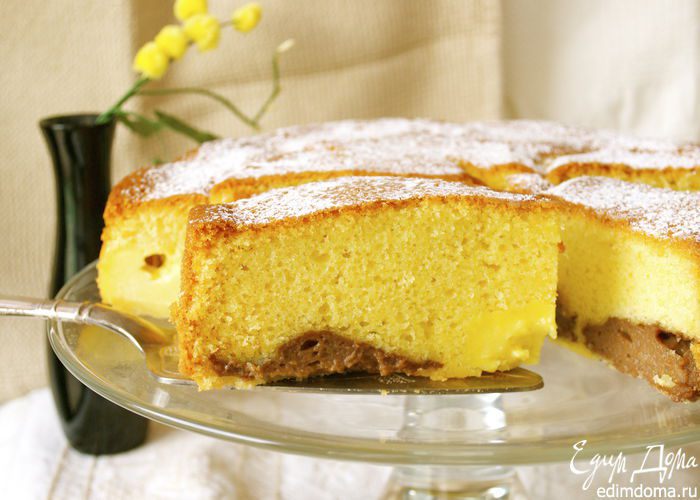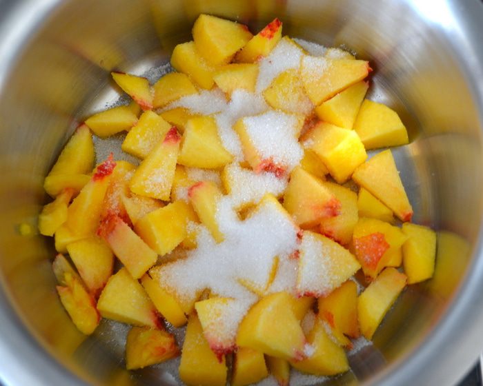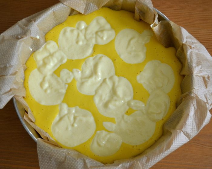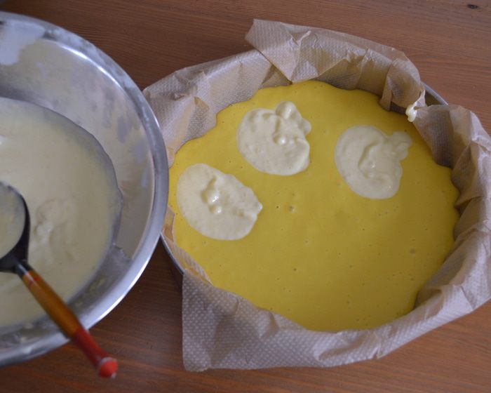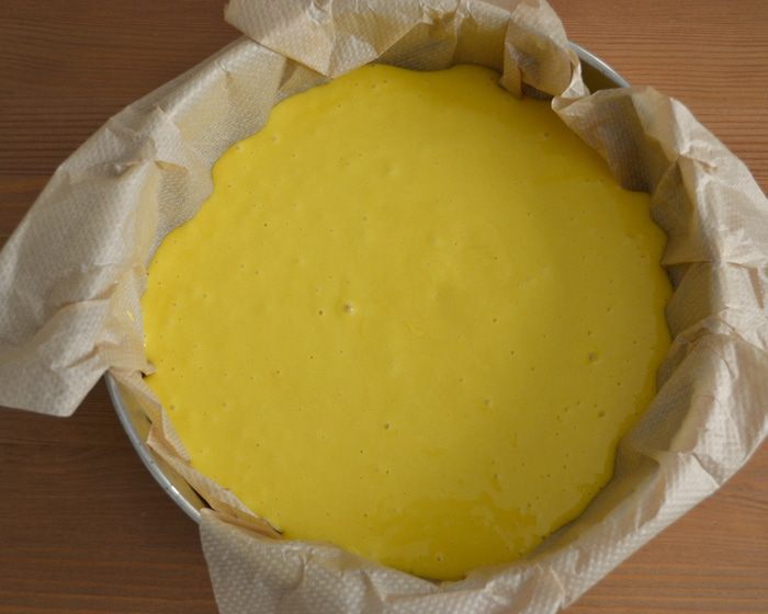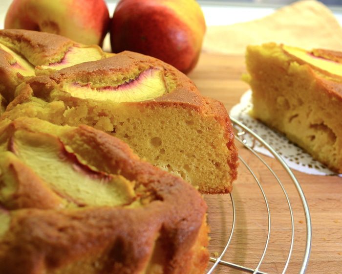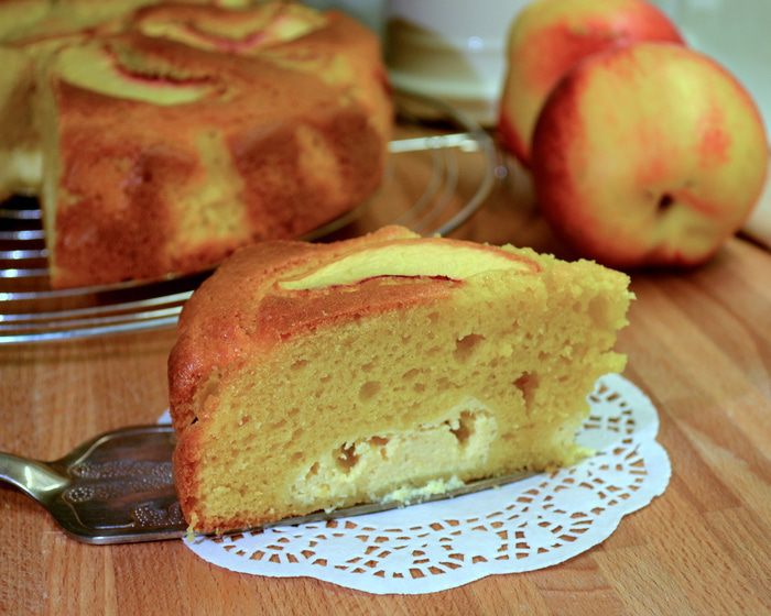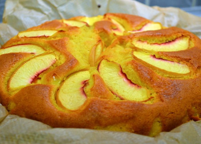 Оставшийся для украшения нектарин нарезать тонкими дольками и распределить по поверхности торта... Поставить запекаться в духовку приблизительно на 1 час. ВНИМАНИЕ! В рецепте указывалось время выпечки 50 минут. Готовность бисквита рекомендовалось проверять деревянной шпажкой... У меня через 50 минут пирог отлично поднялся и слегка подрумянился, но оставался сырым внутри. Я увеличила температуру в духовке до 180 С и прикрыла верх фольгой, время выпечки увеличила на 15 минут.