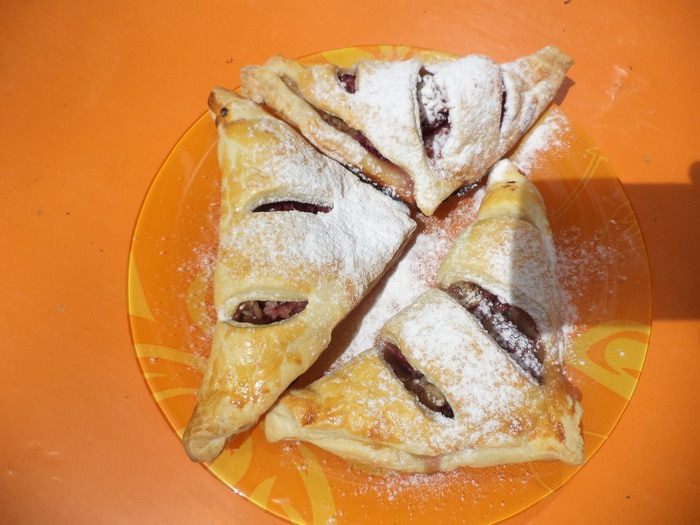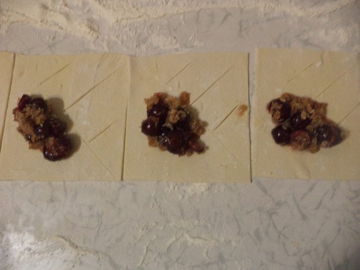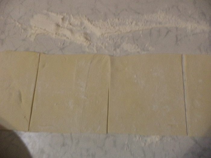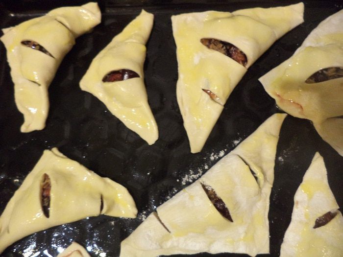 Слоёное тесто раскатать, разрезать его на 12 квадратов. Каждый квадрат условно разделить по диагонали пополам.