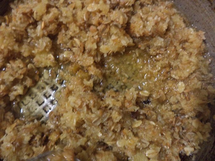 Для начинки растопить на сковороде сливочное масло и подрумянить мюсли с кокосовой стружкой.